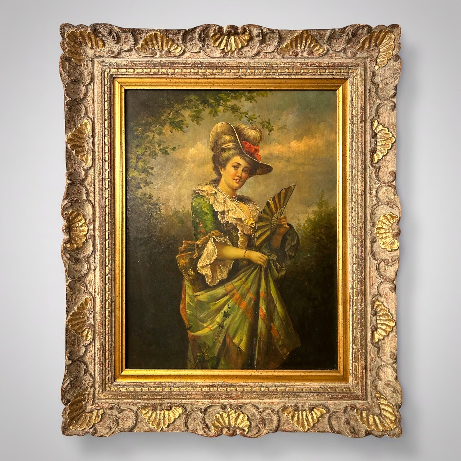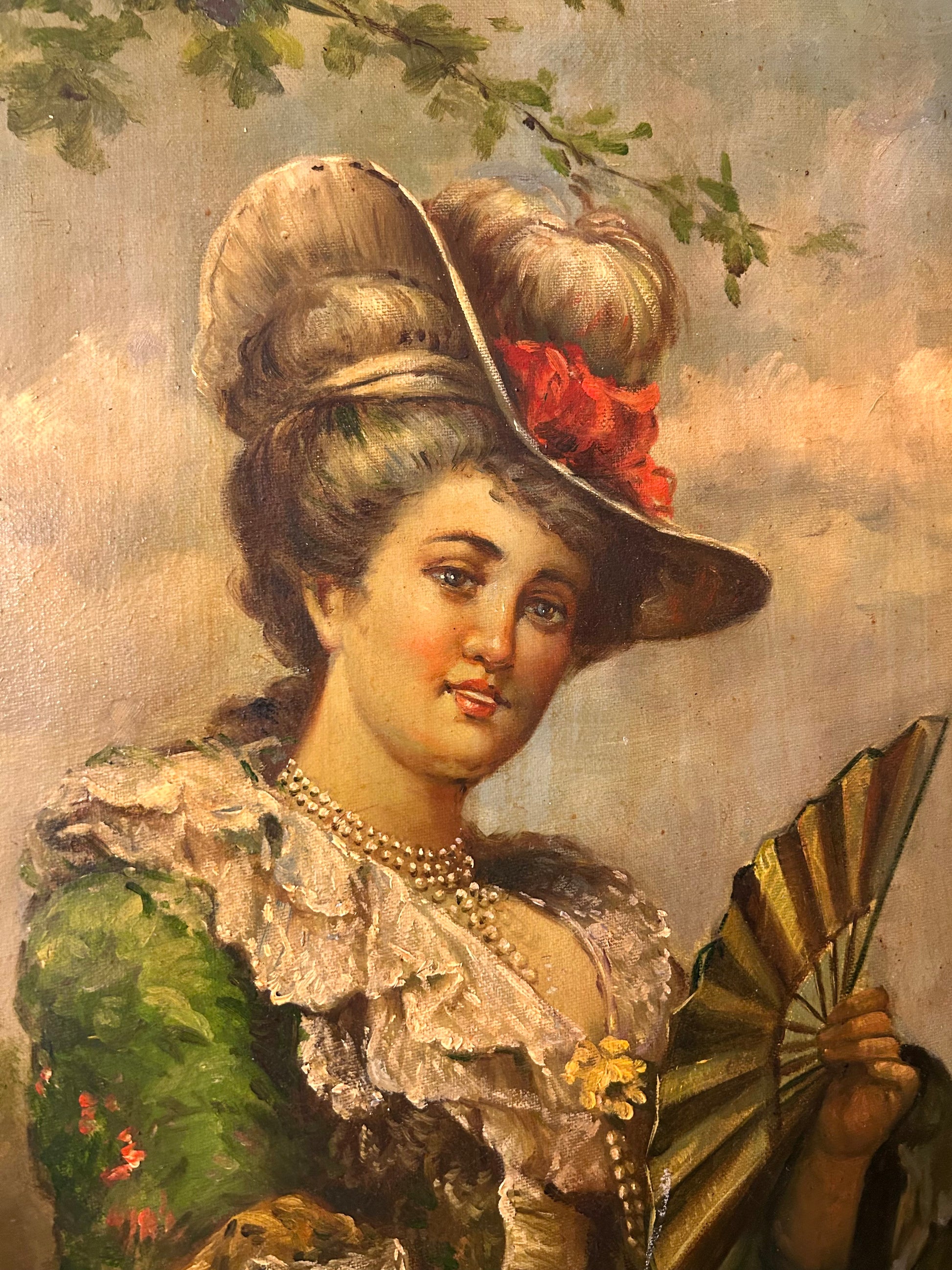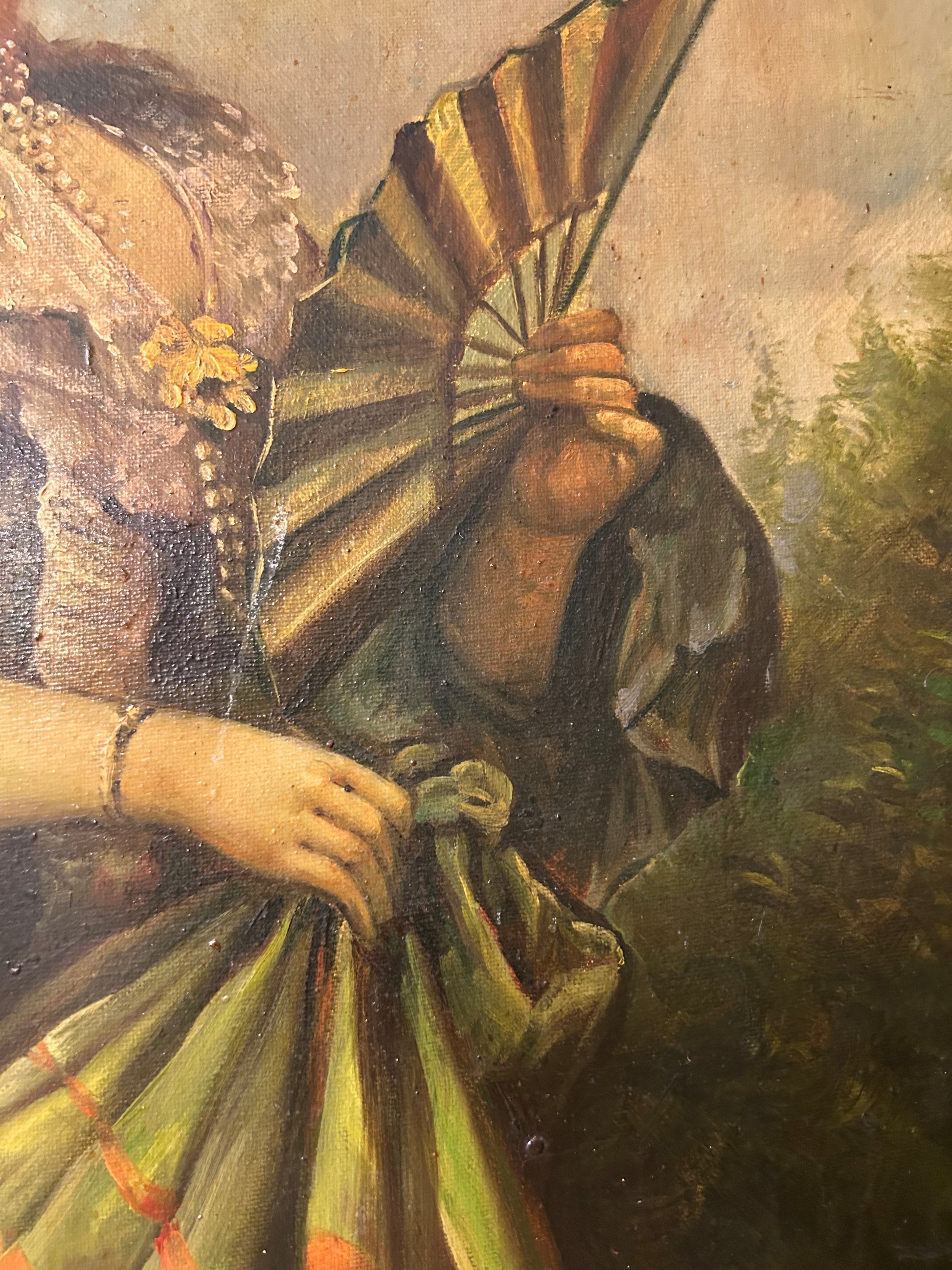 The painting depicts an elegant lady, gracefully posing, delicately holding an open fan in her hands. Her dress is a deep green, richly decorated with white lace that elegantly intertwines along the edges of the sleeves. The fabric of the dress almost seems to move under the play of light and shadow, typical of the Impressionist style, with rapid, fleeting brushstrokes creating a vibrant effect of light. The lady is enveloped in an aura of delicacy and refinement, yet the overall atmosphere conveys a sense of lightness, as if time had stopped in a moment of serenity.