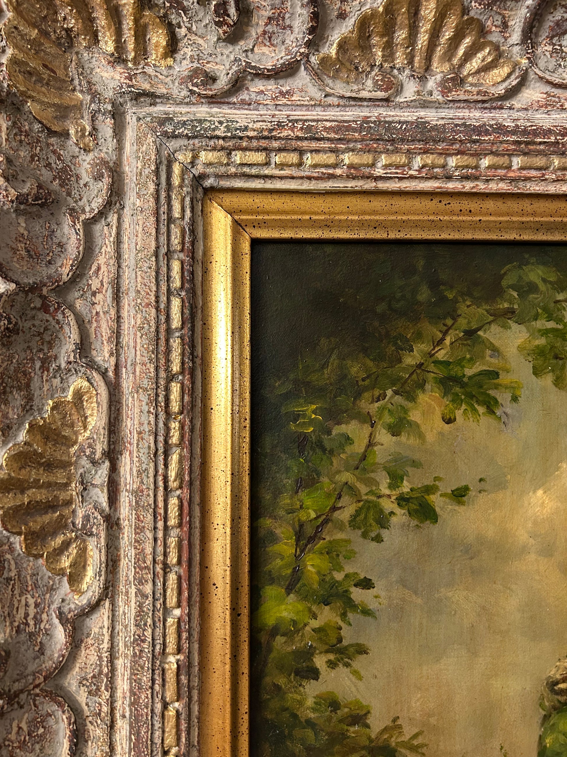 In the background, nature blends into a nuanced landscape: trees and flowers are depicted in soft shades of green and yellow, with light filtering through the foliage in a play of reflections that seem to dance across the canvas, lending the work a dreamlike, intimate feel. The contrast between the figure of the lady and the surrounding nature enhances the sense of timeless elegance and the fusion of human and natural beauty, typical of the Impressionist aesthetic of the late 19th century.