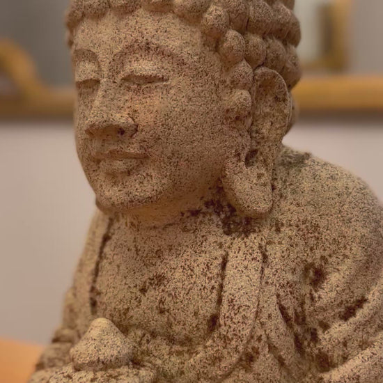 Ogni statuetta è un pezzo unico, realizzato artigianalmente secondo la tradizione balinese, con una finitura grezza che ne valorizza l'aspetto antico e la forza espressiva. Perfetta per creare un angolo meditativo, un altare domestico o un punto focale in giardini zen.