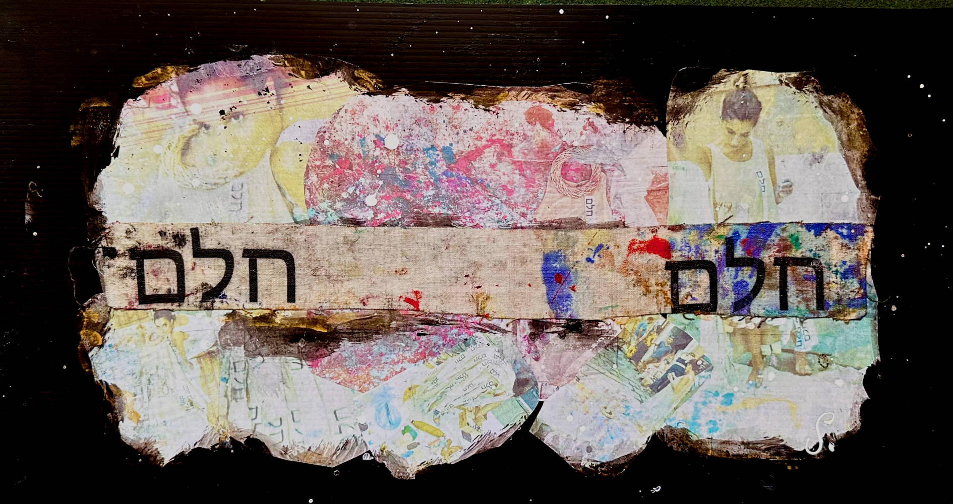 La scritta in ebraico “חלם” (sogno) attraversa la composizione come una soglia concettuale tra reale e onirico. Il colore colato e la materia vissuta non descrivono, ma trattengono l’energia del gesto. L’opera diventa così una reliquia laica della performance, in cui vita e arte si fondono in un processo di trasformazione, memoria e spiritualità.