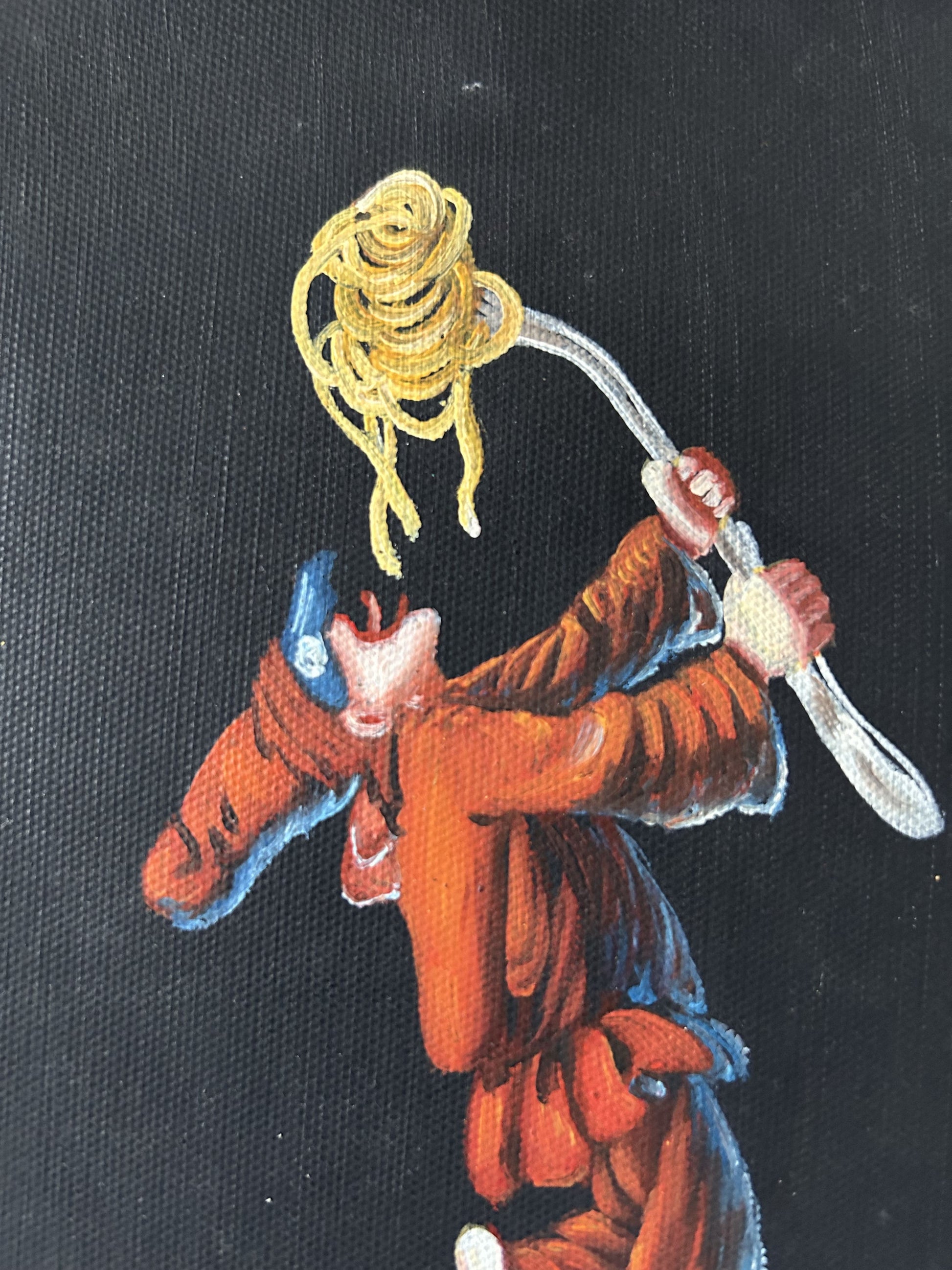 Riproduzione dell'iconico manifesto pubblicitario del 1922 di Achille Luciano MAUZAN (1883-1952) dove Pulcinella, simbolo di Napoli, mangia la pasta con una enorme forchetta.