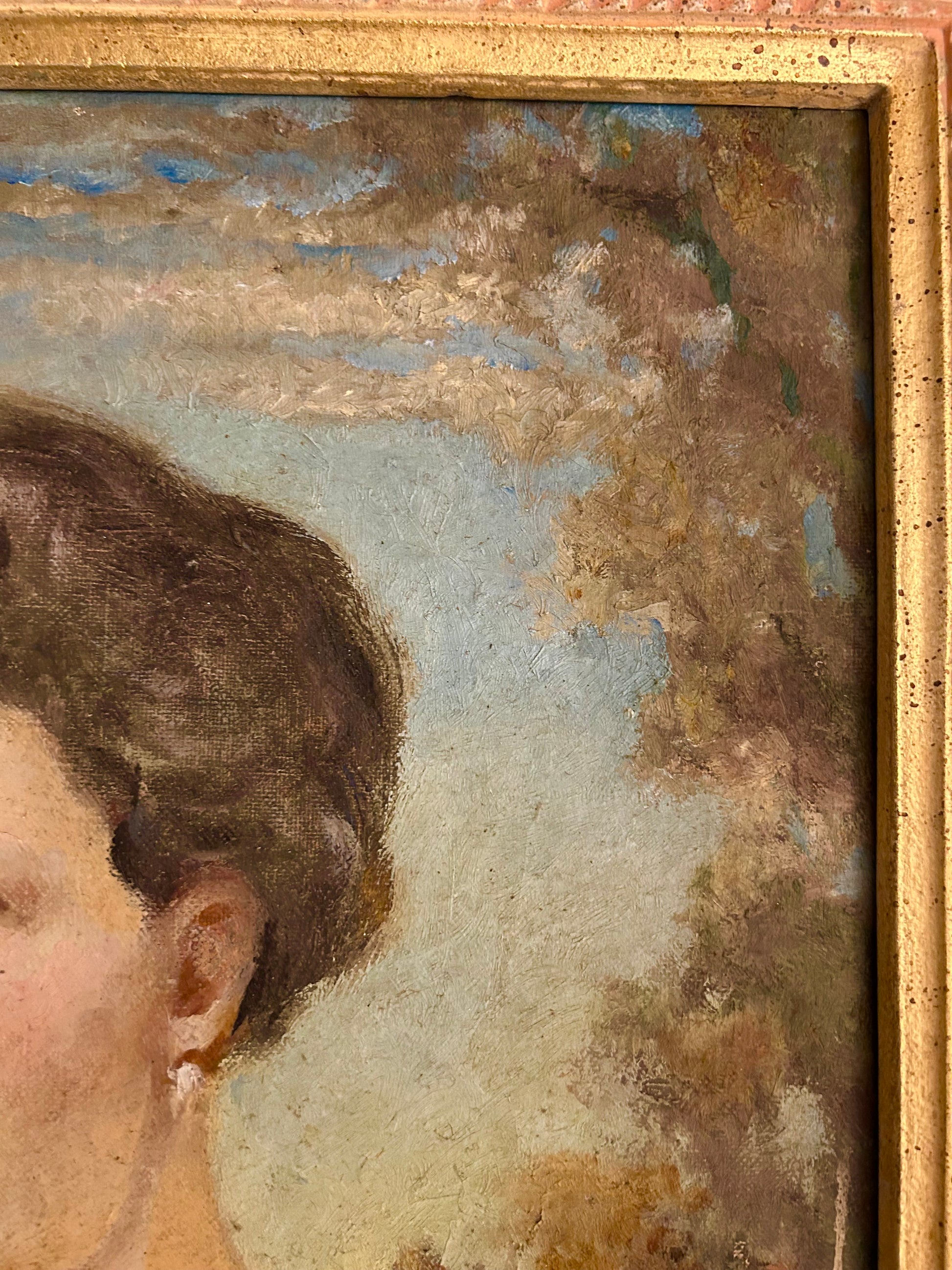 Questo dipinto (olio su tela) raffigura il ritratto impressionista di una donna elegante, con lineamenti delicati e un sorriso lieve. Indossa un abito di tonalità pastello, fluido e raffinato, con una rosa al petto che ne sottolinea la femminilità. Il fondo sfocato evoca un giardino luminoso, mentre la luce gioca sui suoi tratti, creando un’atmosfera intima e vibrante. Il quadro trasmette un senso di leggerezza e grazia, come se la figura fosse pronta a muoversi, catturando la bellezza effimera di un momento.