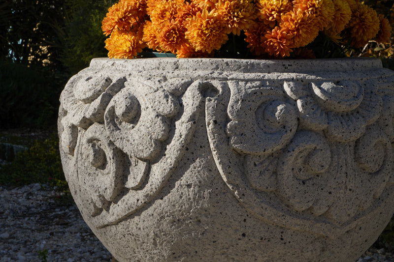 Raffinato vaso tradizionale balinese in polvere di pietra grezza, caratterizzato da eleganti decori floreali in basso rilievo. Realizzato artigianalmente, presenta una finitura naturale e materica che esalta i dettagli scolpiti.